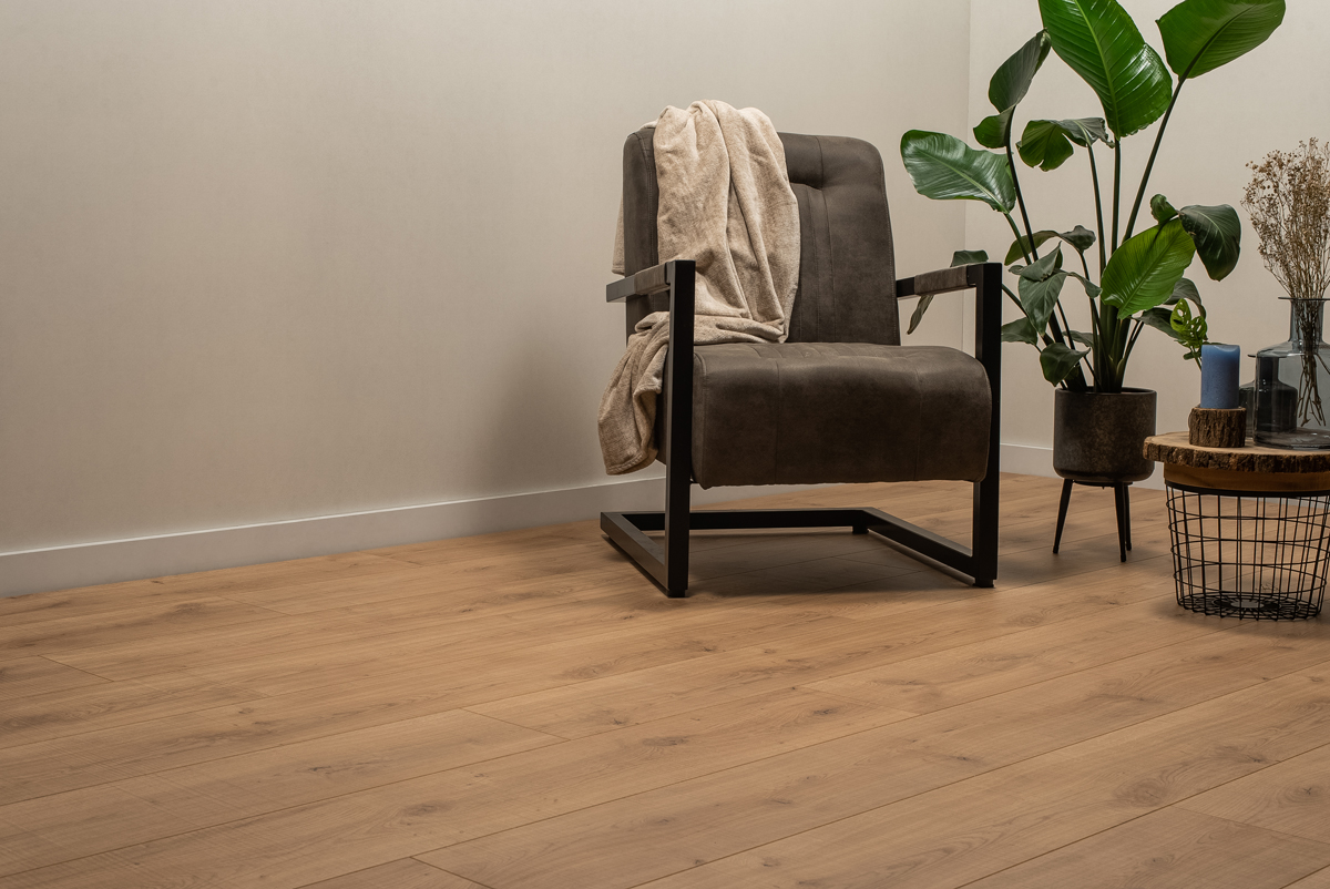 Laminaat leg je zwevend op een geschikte ondervloer. Dat verbetert het loopcomfort en helpt geluid te dempen. Werk af met plinten en profielen voor een strak totaalbeeld.