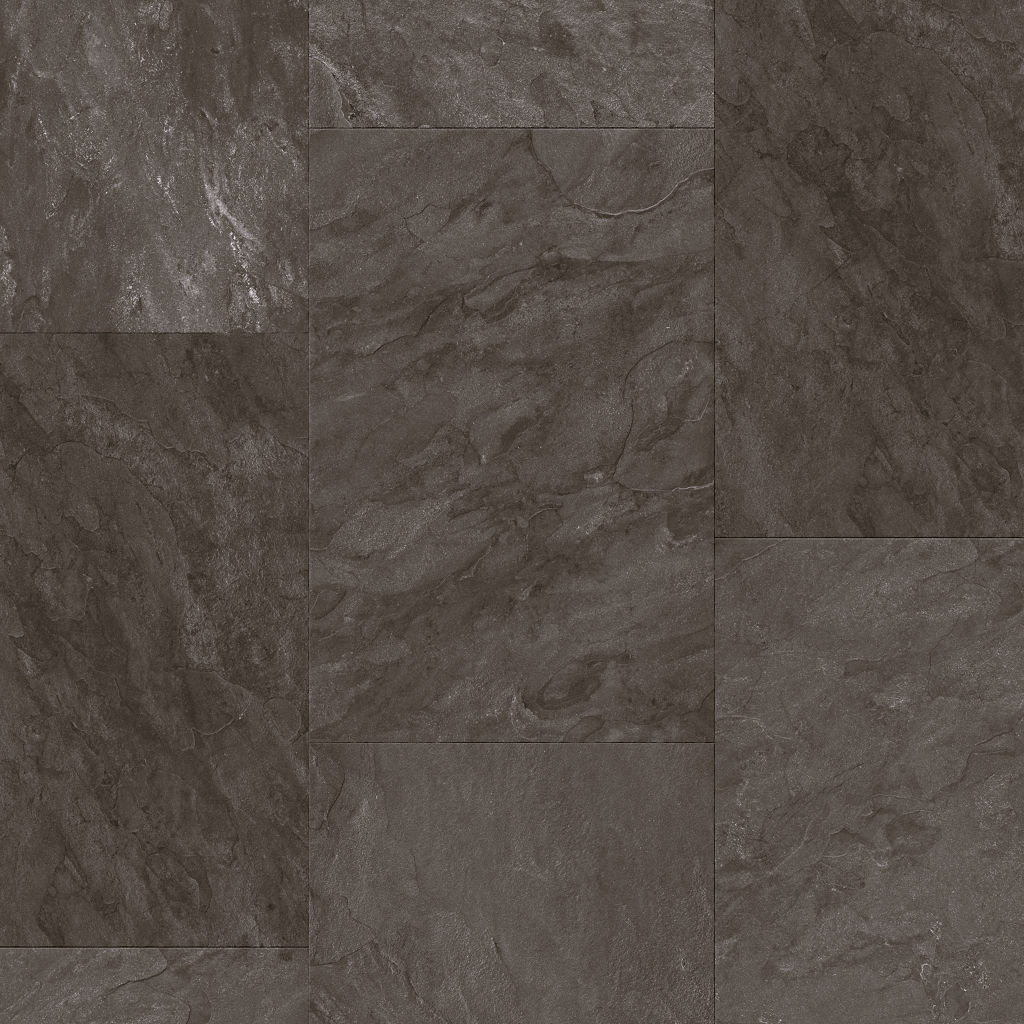 Het donkergrijs decor geeft de vloer een rustige en tijdloze uitstraling. benadrukt het plankeneffect, terwijl het formaat zorgt voor een ruimtelijk geheel.